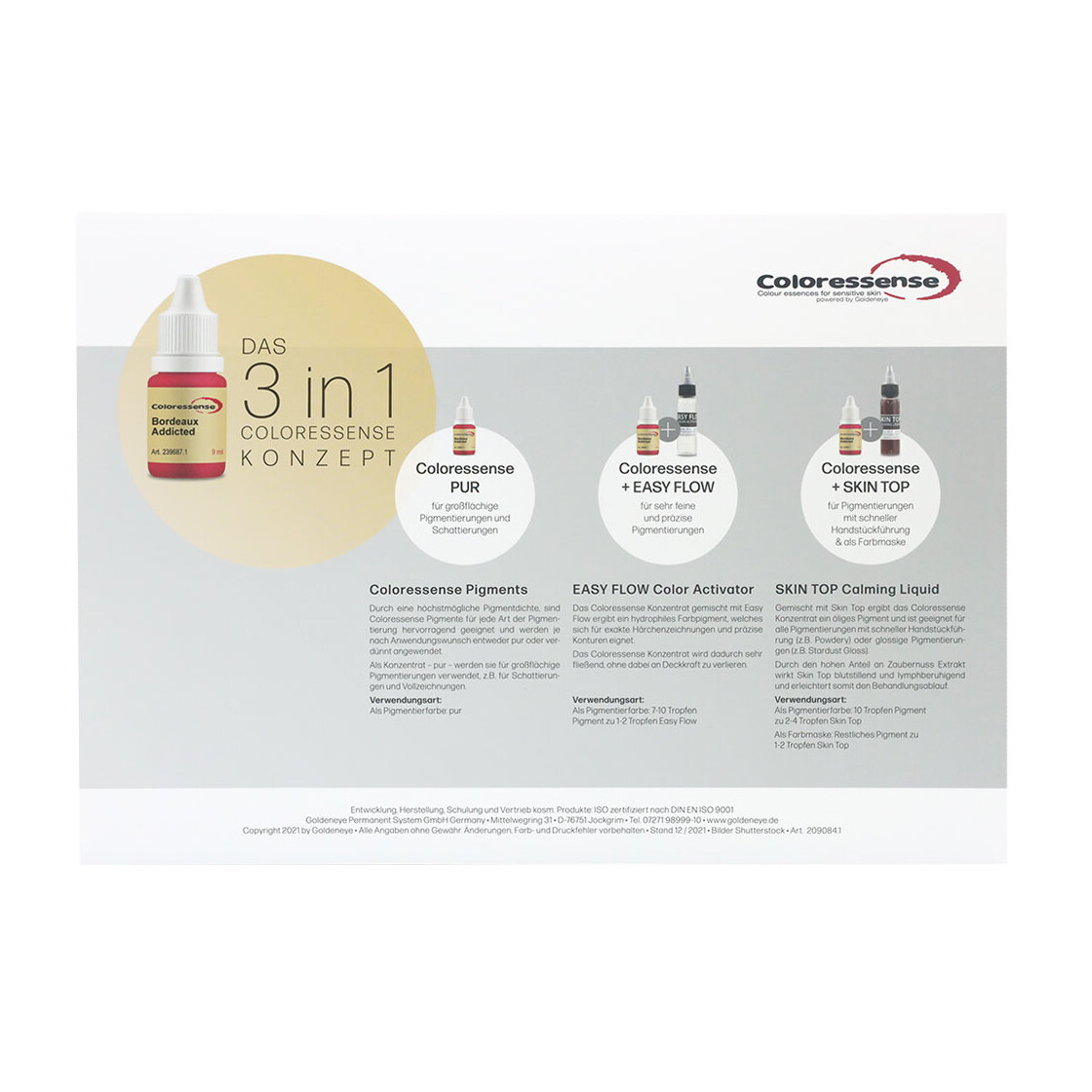GOLDENEYE Coloressense nutzt mit der Advanced Skin Sealing (ASS) Technologie einen optimierten, porenschließenden Effekt. Dieser verschließt die Einstichstelle und verhindert das Ausbluten der Farbe. Die Dispersionsmittel werden ausschließlich aus kosmetischen und pharmazeutischen Rohstoffen hergestellt. Die Farbproduktion wird vom Einkauf über die Analytik und Produktion bis zum Verkauf vollständig dokumentiert.